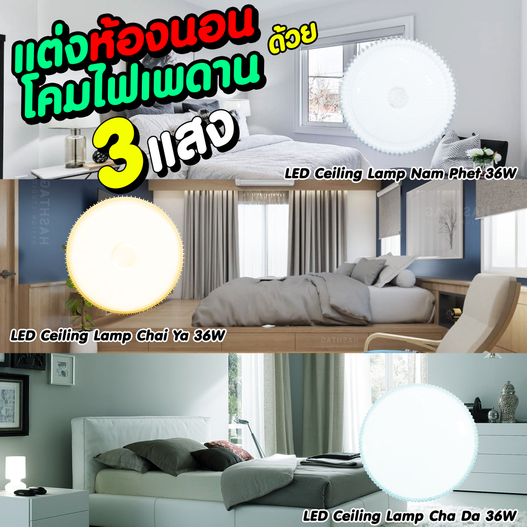 โคมไฟเพดาน LED Ceiling Lamp มาด้วยกันทั้งหมด 3 รุ่น Nam Phet, Chai Ya, Cha Da โคมไฟติดเพดานแอลอีดีที่มี 3 แสงในโคมเดียว ที่ให้คุณสามารถควบคุมสีด้วยปลายนิ้วเพื่อสร้างบรรยากาศในห้องตามที่คุณต้องการ ไม่ว่าจะเป็นแสงสีขาว (Daylight) เหมาะแก่การใช้งานเมื่อต้องการแสงสว่างมากๆ เช่น การทำงาน การอ่านหนังสือ