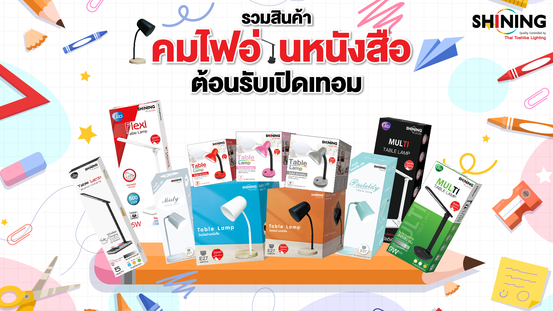 ใกล้จะเปิดเทอมกันแล้ว สำหรับเพื่อน ๆ ที่กำลังมองหาไอเท็มต่าง ๆ ไว้ใช้สำหรับตกแต่งห้อง เพื่อเตรียมพร้อมสำหรับการเริ่มต้นเรียนในเทอมใหม่ สิ่งหนึ่งที่ขาดไม่ได้เลยก็คือโคมไฟ เพราะแสงสว่างที่เพียงพอ จะช่วยถนอมสายตาของเราทำให้การอ่านหนังสือ การทบทวนบทเรียน ทำการบ้าน หรือทำงานต่าง ๆ ได้ดียิ่งขึ้น หลอดไฟโตชิบารวมโคมไฟอ่านหนังสือหลายแบบ หลายดีไซน์ มาให้เลือกชมกันครับ