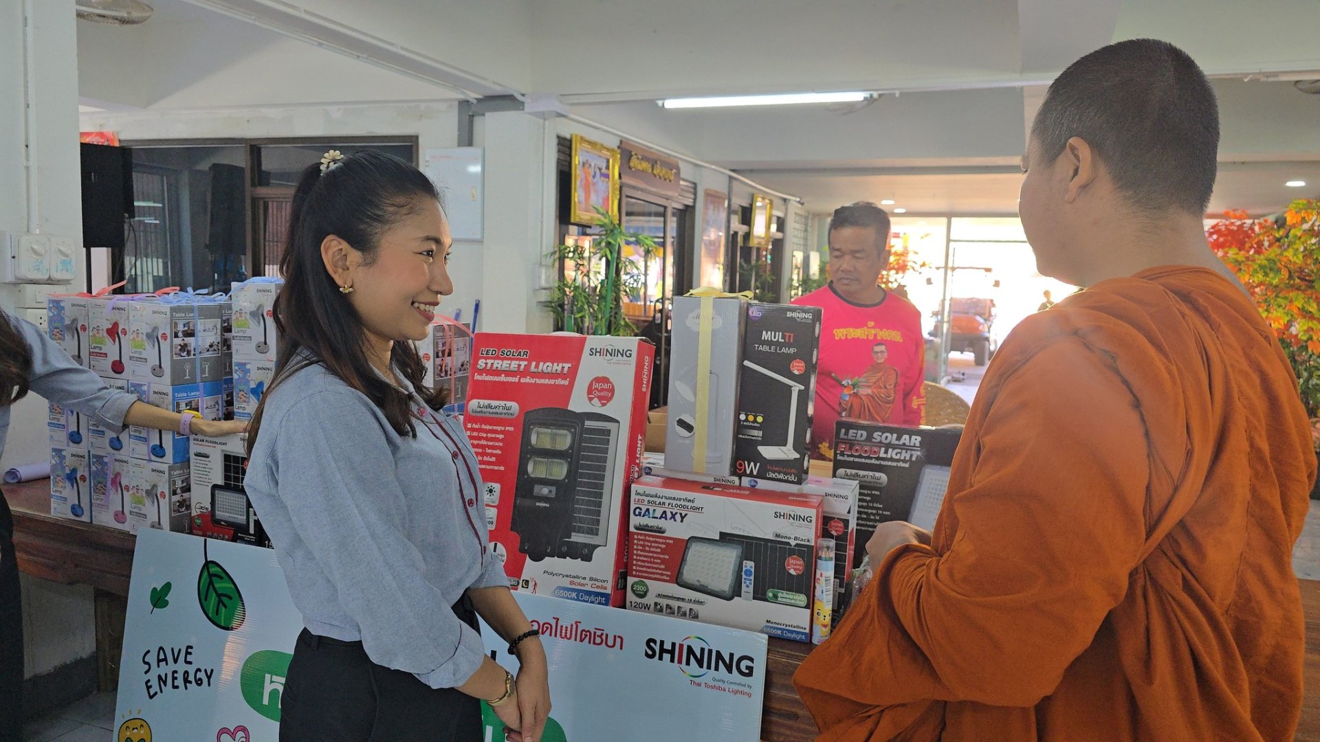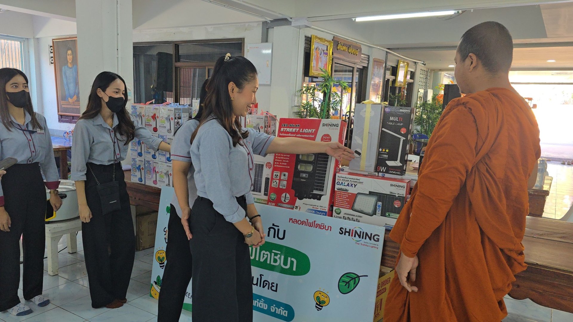 พร้อมกันนี้ยังได้มอบอุปกรณ์ส่องสว่าง อาทิ โคมไฟโซลาร์เซลล์ โคมไฟถนน รวมถึงโคมไฟรักการอ่าน เพื่อให้น้อง ๆ ได้ใช้งานอีกด้วย