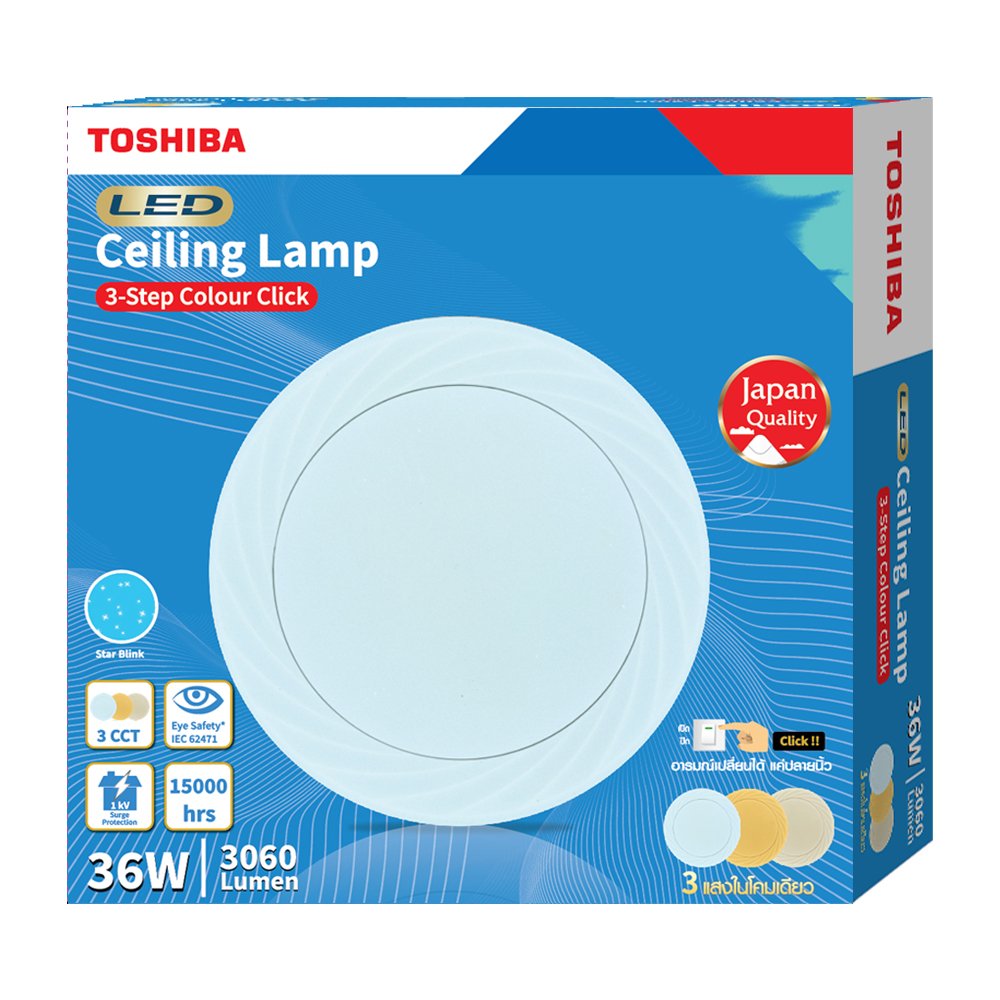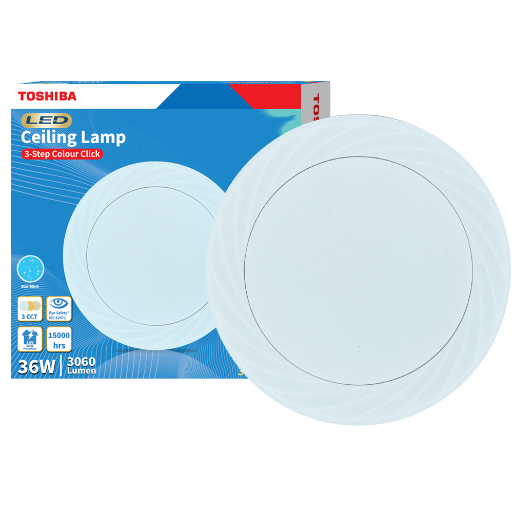 LED ceiling lamp from TOSHIBA. Constructed of high-quality materials, the ceiling lamp not only complements your house but also provides up to 3 light colors (Daylight, Warm white, and Cool white)
