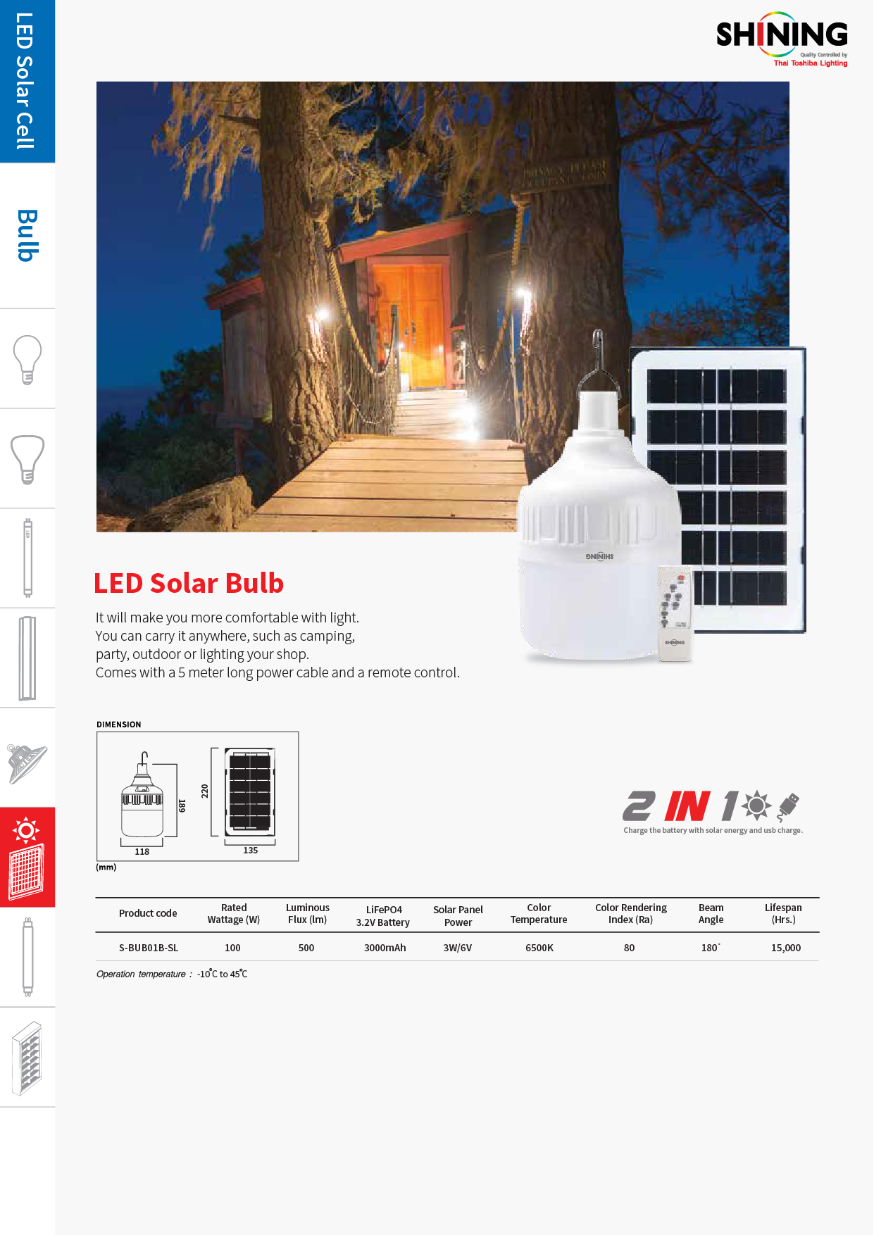 The SHINING LED Solar Bulb 100W is a versatile solar-powered lighting solution that delivers bright and clear illumination without the need for wiring. Powered by 100% solar energy, it helps save electricity while being environmentally friendly.