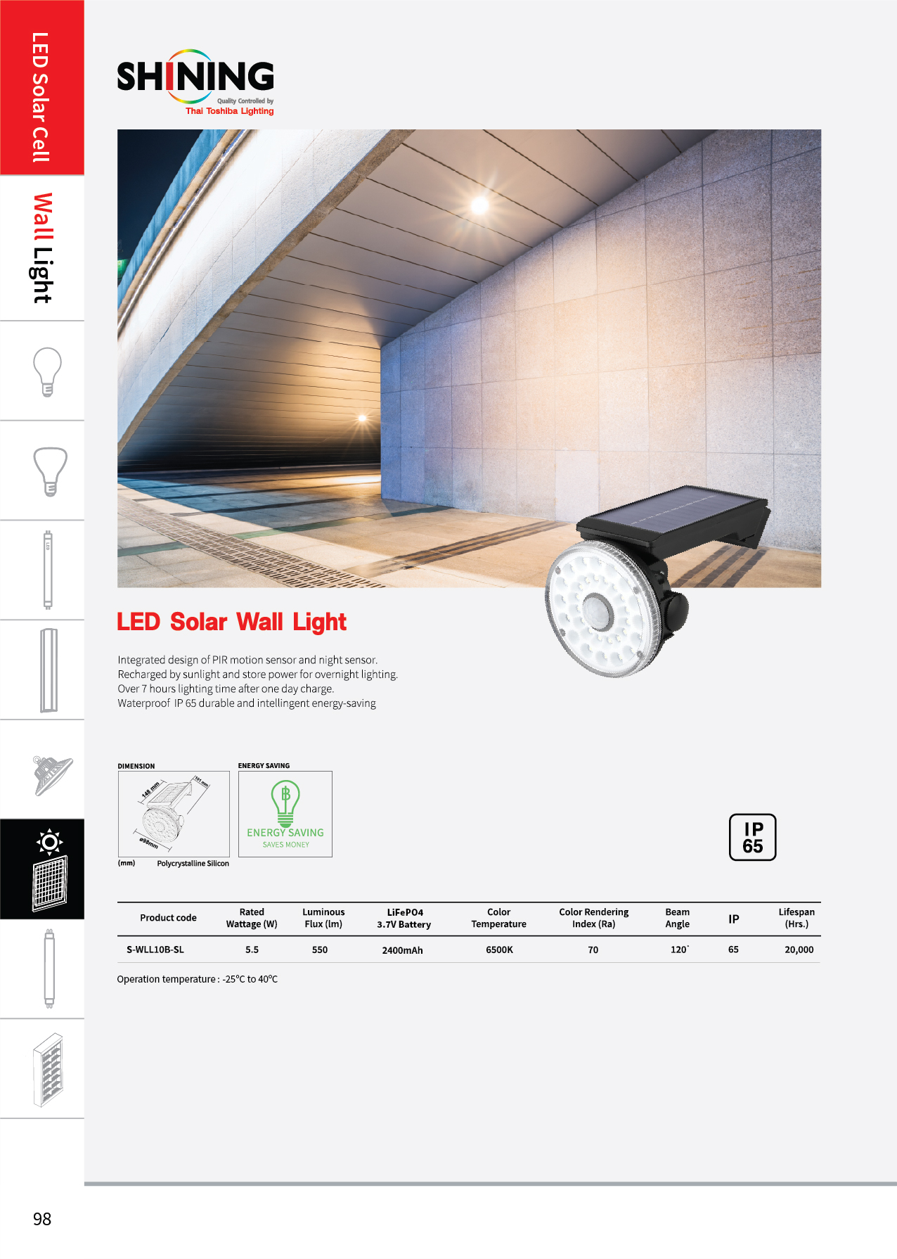 ส่องสว่างให้พื้นที่ภายนอกได้เต็มประสิทธิภาพ ด้วยไฟผนังนอก จากแบรนด์ SHINING ที่ใช้พลังงานแสงอาทิตย์ ด้วยระบบโซลาร์เซลล์ ช่วยให้คุณประหยัดไฟได้ ทนทานต่อสภาพอากาศ ด้วยมาตรฐาน IP65 ซึ่งถูกออกแบบมาเพื่อการใช้งานภายนอกโดยเฉพาะ มาในโทนแสง Daylight ส่องสว่างได้อย่างชัดเจน พร้อมเพิ่มความสะดวกสบายในการใช้งานยิ่งขึ้นด้วยระบบ Light Sensor ตรวจจับแสงสว่าง เปิด-ปิดไฟอัตโนมัติตามแสงอาทิตย์ นอกจากนี้ยังมีระบบ Motion Sensor ที่สามารถตั้งค่าได้ตามต้องการ ให้บริเวณบ้านสว่างไสว ทำกิจกรรมต่างๆ ได้อย่างสะดวก