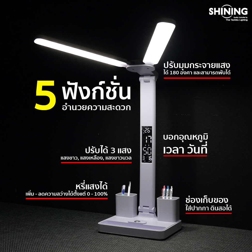 ให้การอ่านหนังสือของคุณสะดวกยิ่งขึ้นได้ด้วยไฟอ่านหนังสือ จากแบรนด์ SHINING ที่มาพร้อมดีไซน์ทันสมัย โดดเด่นด้วยฟังก์ชันการทำงานที่หลากหลายโดยเน้นการอำนวยสะดวกแก่ผู้ใช้งานให้มากที่สุด เช่น นาฬิกาบอกเวลา, ปฏิทินบอกเวลาในแต่ละวัน และการวัดอุณหภูมิภายในห้อง และยังสามารถหมุนปรับองศาของตัวโคมได้ นอกจากนี้ยังสามารถปรับแสงได้ถึง 3 แสงในโคมเดียวปรับเปลี่ยนแสงได้ง่ายๆ ด้วยระบบสัมผัส เหมาะสำหรับทุกกิจกรรมที่เราต้องการใช้งาน อีกทั้งยังสะดวกต่อการเก็บของด้วยช่องเก็บอุปกรณ์