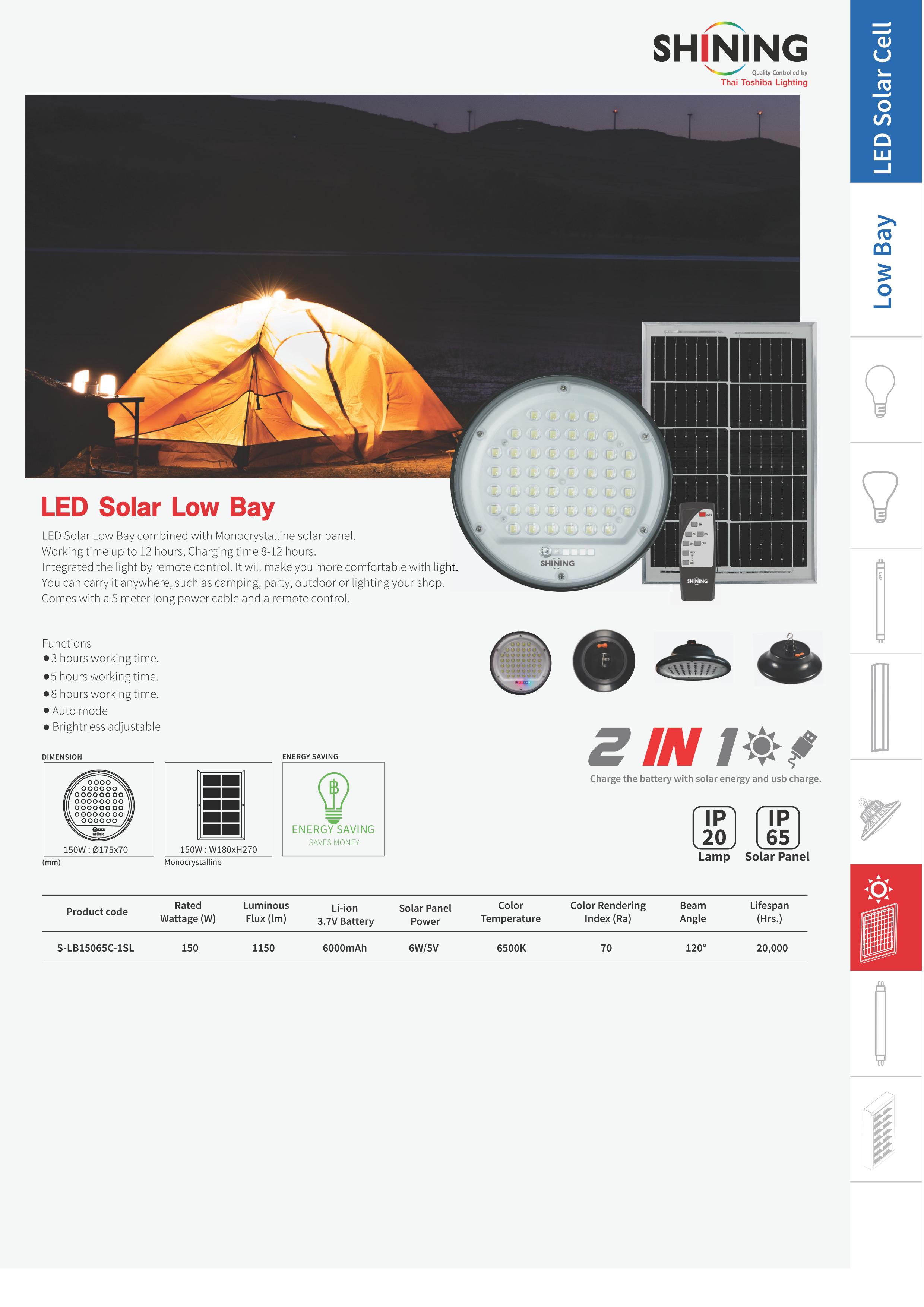 มอบความสว่างไสวให้ช่วงเวลาสนุกสนานไม่มีสะดุดด้วย โคมไฟโซล่าเซลล์ โลว์เบย์ ให้แสงสว่างโทนสีขาว Daylight เพิ่มความโดดเด่นด้วยการโฟกัสแสงเฉพาะจุด รองรับการชาร์จผ่านพลังงานแสงอาทิตย์และ USB ใช้งานได้ต่อเนื่อง แม้ในสถานการณ์ฉุกเฉิน สามารถควบคุมการตั้งค่าได้อย่างสะดวกด้วยรีโมตคอนโทรล