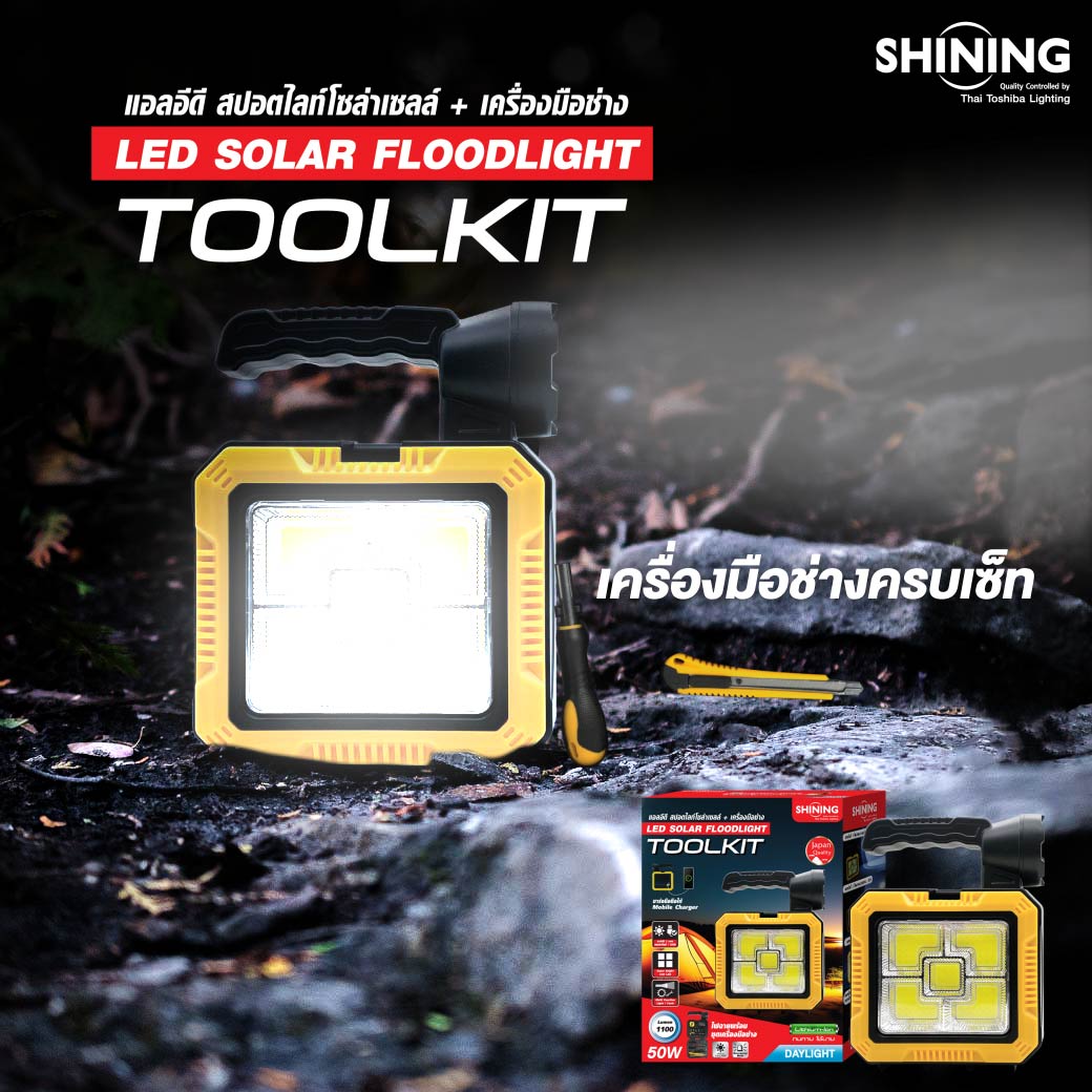 LED Solar Floodlight Toolkit 50W ปรับโหมดได้หลากหลาย ไม่ว่าจะเป็นไฟฉาย, ไฟสปอตไลท์, ไฟฉุกเฉิน หรือไฟกระพริบ มาพร้อมอุปกรณ์ช่างในตัว